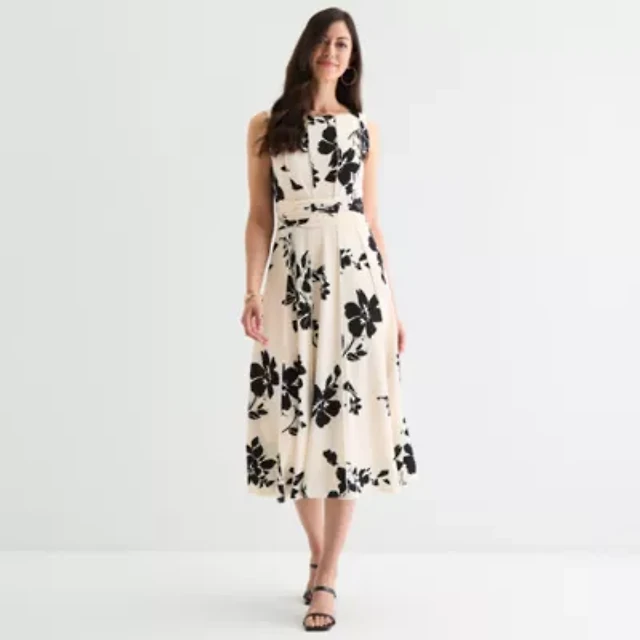 Perceptions Womens Sleeveless Floral Midi Fit + Flare Dress