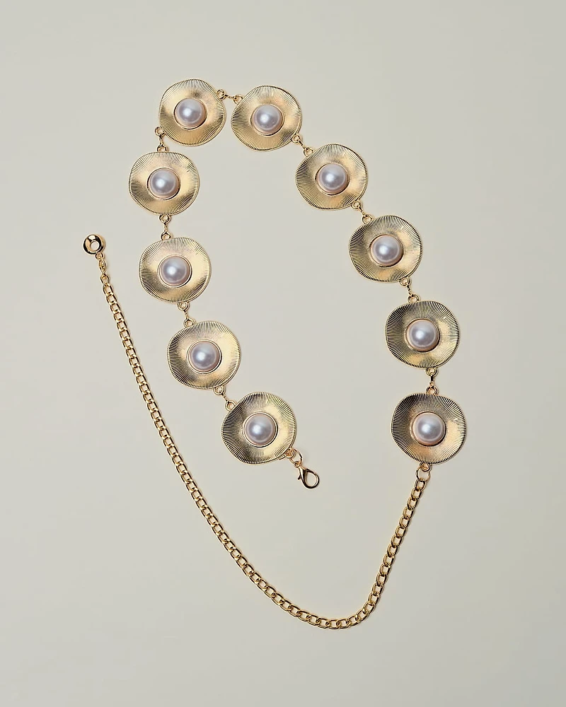 Make a statement with this eye-catching chain belt, featuring bold textured discs accented with luminous pearl centers. Equal parts vintage glam and modern flair, it’s the perfect piece to cinch your look with a touch of shine and personality.
