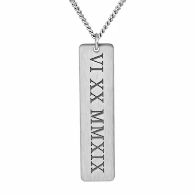 Personalized Brushed Roman Numeral Date Engraved Vertical Bar Pendant Necklace