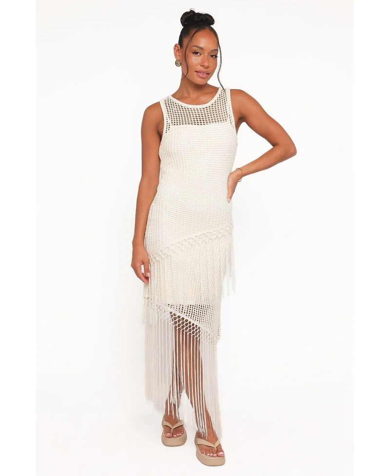 Step into elegance with the Adella Midi Dress. This piece features a sophisticated crochet overlay and a tassel frill hemline, creating a look that's both chic and free-spirited. Designed with a classic round neckline and a simple pull-on style, it offers comfort without compromising on style.