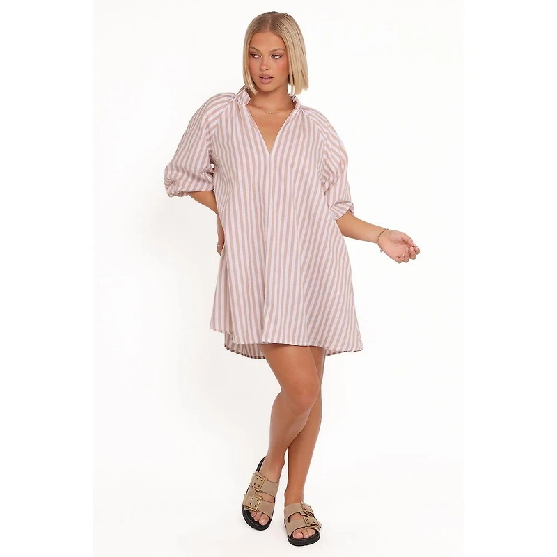 Effortless style meets everyday elegance with the Doran Mini Dress - Beige White . Its breezy mini length and flattering V-neckline make it the perfect go-to piece for any occasion, while the mid-length sleeves with elasticised cuffs offer a comfortable and chic touch.