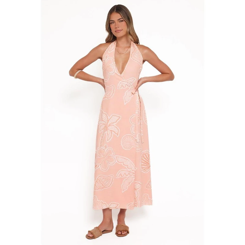 Designed with a gorgeous motif print, this dress is perfect for your next garden party or beachside brunch. It features a flattering halterneck and a classic wrap design that ties at the waist, creating a beautiful silhouette that flows down to a midi length.