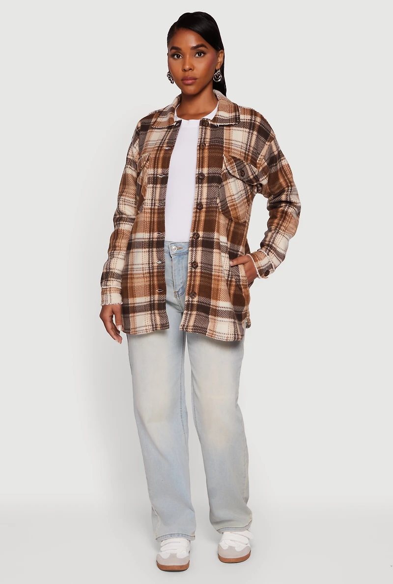 Cozy up your casual looks with this Plaid Sherpa Lined Fleece Long Sleeve Button Front Jacket. Perfect for layering on those chilly days, this shacket combines the classic plaid vibe with ultra-soft fleece and sherpa lining to keep you warm without sacrificing style. The button front and shirt collar add a timeless touch, making it easy to dress up or down. Whether you're running errands or meeting friends, this jacket is your new go-to for effortless cool and comfort. Soft fleece and sherpa lining for all-day warmth Classic plaid pattern adds a trendy edge Button front closure for easy layering Long sleeves with a shirt collar for a polished look Perfect casual outerwear piece for fall and winter Model Pictured Wearing Size S Height 5 ft 8 in, Bust 32 in, Waist 25 in, Hips 36 in Fits True To Size Measurements Full Length: 27 in Content and Care Material: 100% Polyester Care Instructions: Machine Wash, Tumble Dry Country Of Origin: Bangladesh Rainbow Item Number 3086038341162 BROWN - 3086038341162020