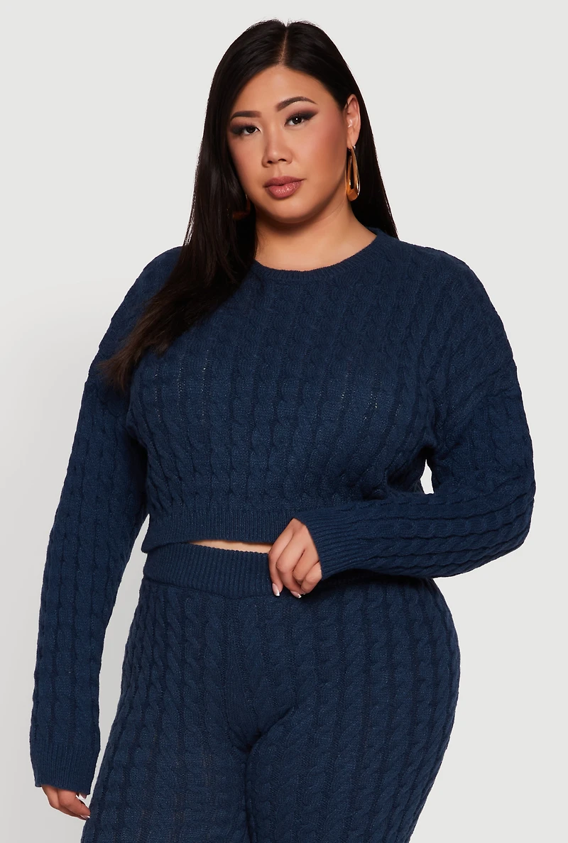 Plus Cable Knit Cropped Long Sleeve Sweater