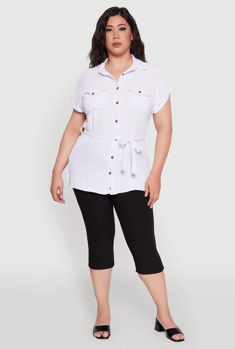 Plus Classic Fit Crepe Knit Tie Waist Tunic Shirt