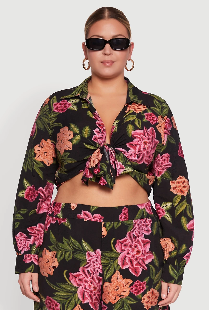 Plus Floral Long Sleeve Tie Front Crop Top in San Juan, PR