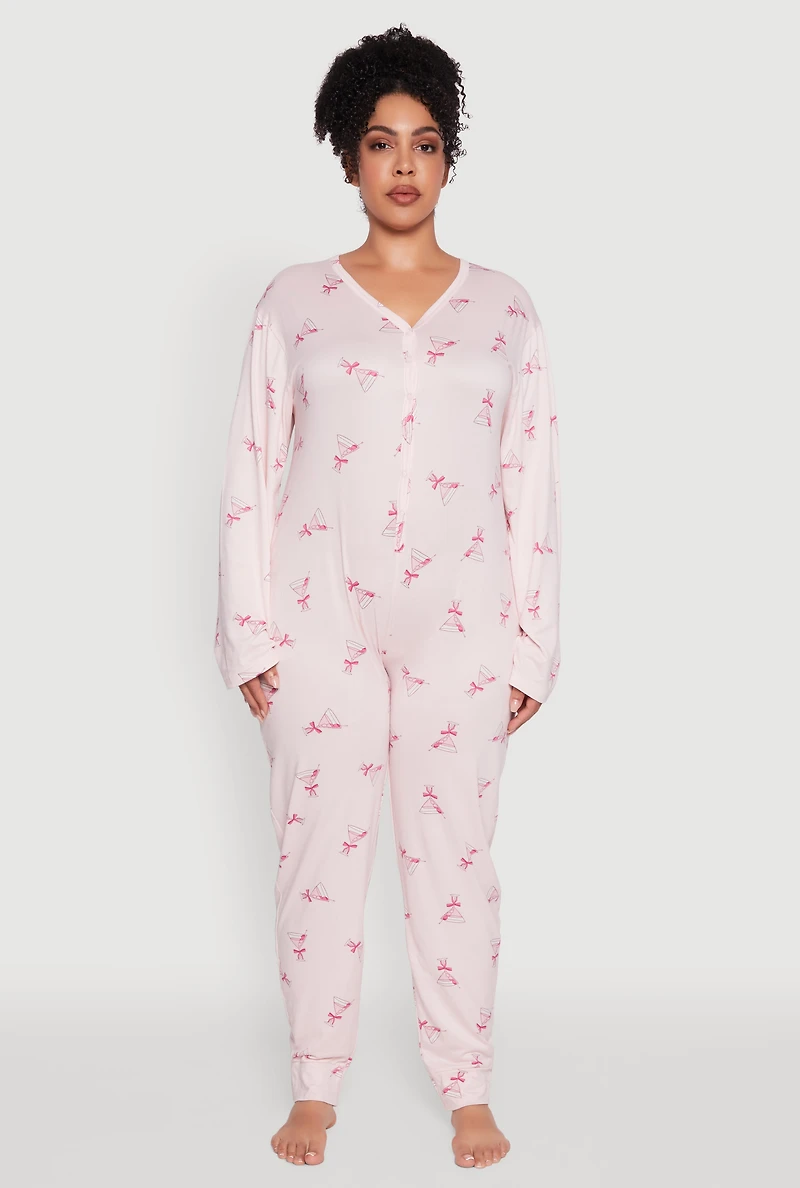 Slip into cozy vibes with this Plus Size Martini Graphic Print Pajama Onesie. Perfect for those chill nights when you want to lounge in style and comfort, this long-sleeved, V-neck union suit features a fun martini graphic that adds a playful twist to your sleepwear. The tapered full-length pant legs hug your curves just right, making it your go-to for relaxing or Netflix marathons. Affordable, flattering, and made to move with you, this onesie is the ultimate treat-yourself piece you didn’t know you needed.