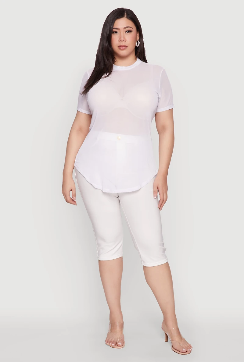 Upgrade your wardrobe with the Plus Size Mesh Crew Neck Tunic Top, a perfect blend of comfort and style that works for any occasion. Its classic fit and timeless silhouette make it a versatile staple, while the sheer mesh fabric adds a touch of edgy flair. Whether you're dressing up or keeping it casual, this top is your new go-to for effortless chic. Plus, the short sleeves and tunic hem provide a relaxed fit that moves with you. Pair it with your favorite bottoms and make a statement that’s uniquely you. Made from breathable mesh fabric for all-day comfort Classic fit with a timeless silhouette that flatters all body types Short sleeves and crew neckline for a casual yet stylish look Tunic hem adds a relaxed and versatile touch Sheer design for a bold, fashion-forward vibe (undergarments sold separately) Perfect for dressing up or down to suit any occasion Model Pictured Wearing Size 1X Height 5 ft 10 in, Bust 38 in, Waist 33 in, Hips 47 in Fits True To Size Content and Care Material: 95% Polyester, 5% Spandex Care Instructions: Machine Wash, Tumble Dry Country Of Origin: Egypt Rainbow Item Number 1912038343478 WHITE - 1912038343478010