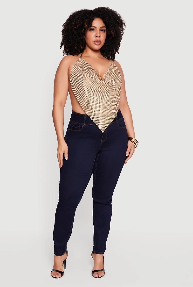 Plus Rhinestone Hanky Hem Open Back Halter Top