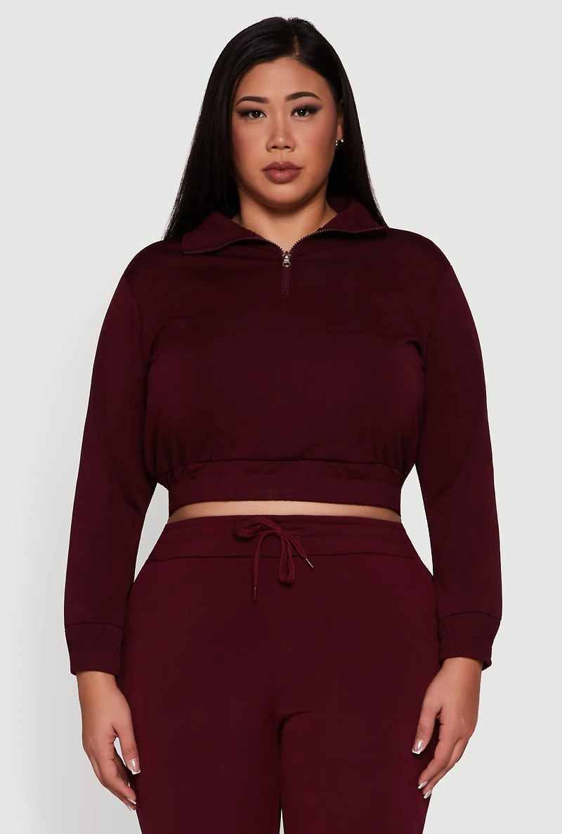 Step up your casual game with this Plus Size Scuba Cropped Quarter Zip Pullover Sweatshirt. Designed for those who love effortless style and all-day comfort, this sweatshirt features a sleek quarter zip and a flattering cropped fit that pairs perfectly with your favorite high-waisted jeans or leggings. Made from soft scuba fabric, it offers a smooth, structured feel that keeps you cozy without weighing you down. Whether you're running errands or chilling with friends, this classic fit piece brings a fresh athleisure vibe to your wardrobe. Soft and smooth scuba material for comfort and style Flattering cropped length that pairs well with high-waisted bottoms Quarter zip closure for easy layering and adjustable coverage Classic fit with a timeless silhouette that suits all body shapes Long sleeves and collared neckline for a polished casual look Solid color design perfect for mixing and matching Ideal for casual outings and athleisure wear Model Pictured Wearing Size 1X Fits True To Size Content and Care Material: 60% Cotton, 35% Polyester, 5% Spandex Care Instructions: Machine Wash, Tumble Dry Country Of Origin: China Rainbow Item Number 3961063407855 BURGUNDY - 3961063407855364