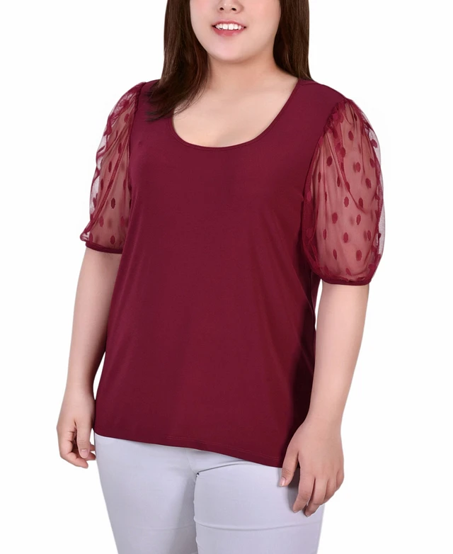 Plus Size Elbow Sleeve Crepe Top with Mesh Dotted Sleeves
