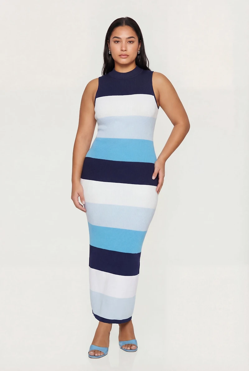 This sleeveless sweater dress features a mock neck and a curve-hugging silhouette that flatters plus size figures. Its long length and striped pattern create a casual yet polished look perfect for everyday wear.