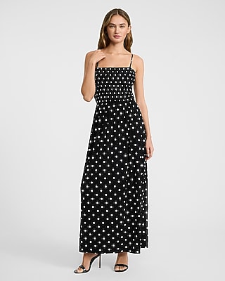 A modern and playful maxi dress, perfect for warmer weather. This classic polka dot smocked dress features adjustable spaghetti straps, a square neckline, on seam pockets, and a flattering back cutout.