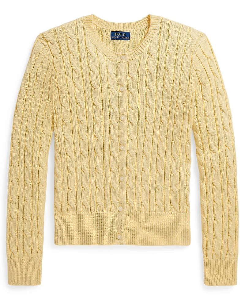 Step into refined knitwear with this Polo Ralph Lauren sweater accented by metallic yarns and a classic cable-knit pattern. A club collar, long sleeves, and buttoned placket complete its polished silhouette.