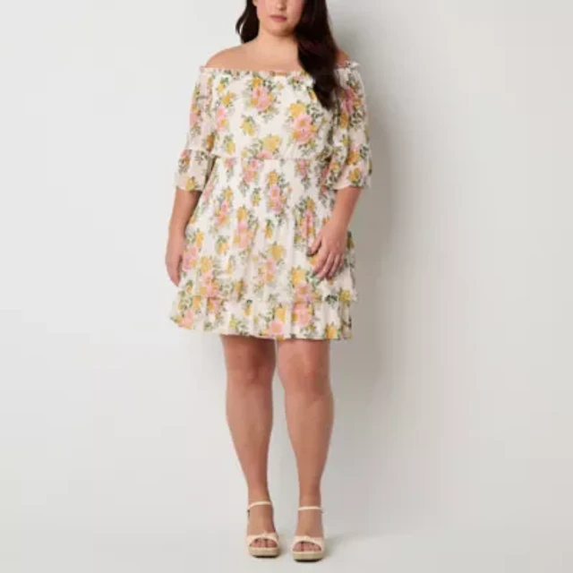 Premier Amour Off The Shoulder Womens Plus 3/4 Sleeve Floral Fit + Flare Dress