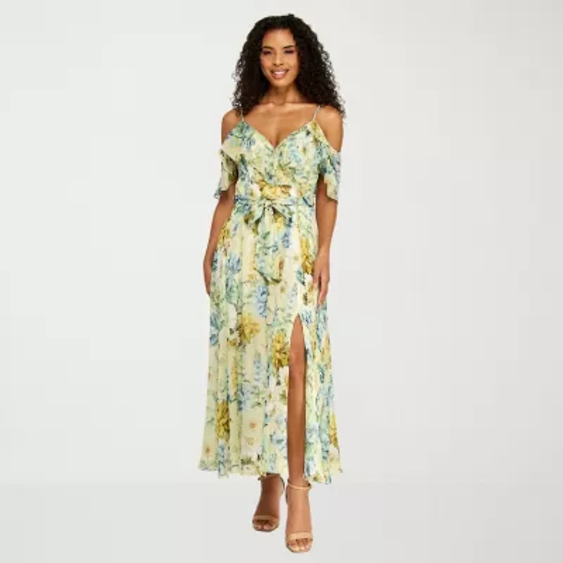 Premier Amour Womens Short Sleeve Cold-Shoulder Floral Midi Fit + Flare Dress