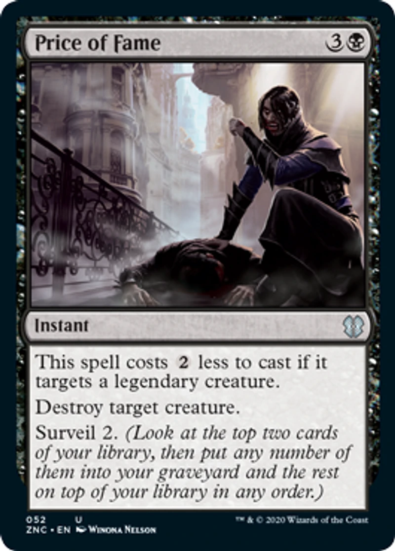 This spell costs 2 less to cast if it targets a legendary creature.Destroy target creature.Surveil 2.