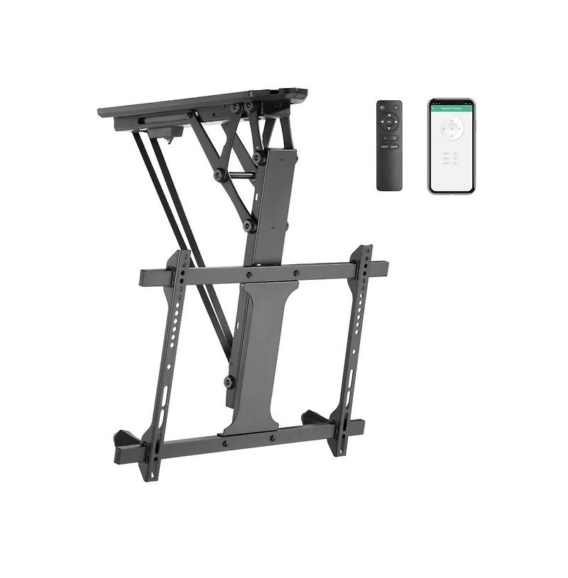 Experience unparalleled convenience and space-saving functionality with our Motorized Ceiling Tv Mount, designed to elevate your viewing experience to new heights. Say goodbye to bulky Tv stands and hello to a sleek, clutter-free environment with our space-saving solution. Take control of your entertainment experience with ease using the included remote or our smartphone app powered by Tuya technology. Whether you're lounging on the couch or entertaining guests, the power to adjust your Tv is literally at your fingertips, offering unparalleled convenience and versatility. Equipped with a powerful onboard motor, our Ceiling Tv Mount ensures safe, stable, and reliable use, providing you with peace of mind while enjoying your favorite shows and movies. With support for Tvs ranging from 32" to 70" and weighing up to 77 lbs, as well as compatibility with Vesa patterns from 200x100 to 600x400, this mount caters to a wide range of setups and TV models.