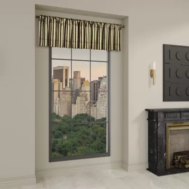 The Charleston black window valance feature a sophisticated woven satin geometric stripe in metallic black and gold. Fully lined to provide darkness for comfortable sleep and relaxation. The valance is engineered and finished with a tailored hem with plush satin fabric and easy to hang back-tabs on the reverse. Designed to coordinate with the Charleston black window panels to add a modern approach to your bedroom windows. In order to achieve the look in the photo we recommend purchasing 2 valances (each sold separately).