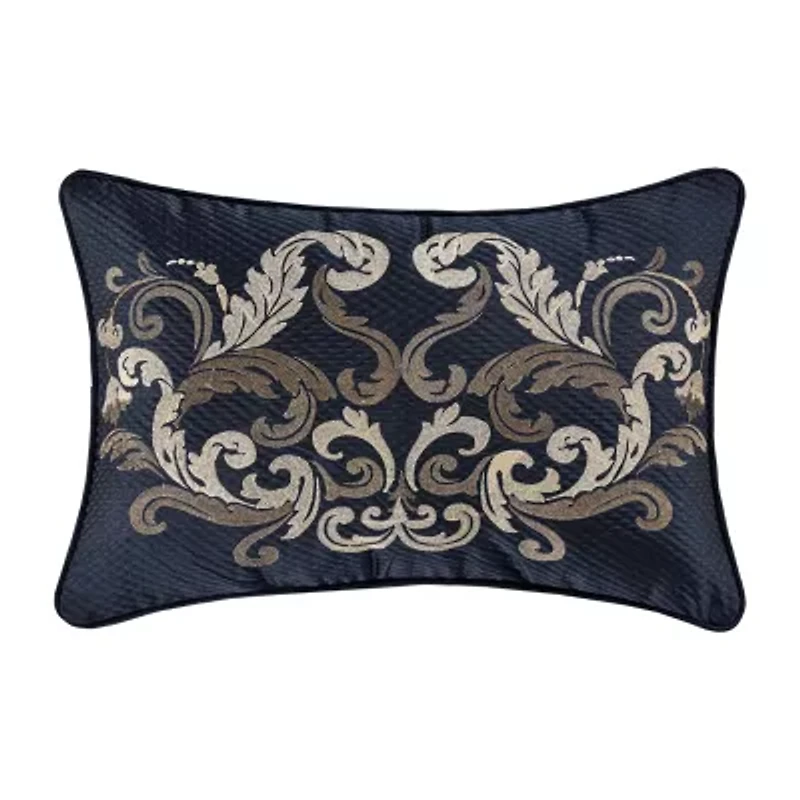 The Grand Isle Boudoir Pillow is crafted with a classic royal blue silky texture fabric and intricate scroll embroidery in shades of gold. Self-fabric piping all around finishes the fine quality accent and is made to coordinate with the Grand Isle bed set.