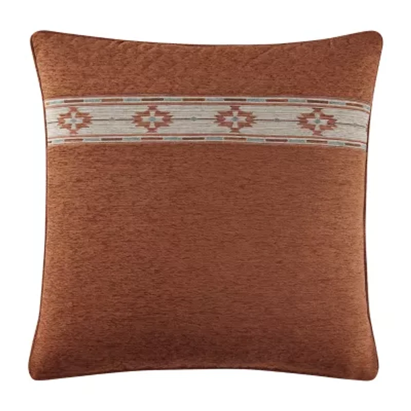 The Jefferson euro sham features layers of detail to add the finishing touch to your bedding. The plush velvet clay chenille fabric is quilted and embroidered with a southwest inspired band in shades of sand and turquoise. It's corded all-around with a hidden zipper closure, allowing you to reverse the sham. Pair this pillow sham with the Jefferson bedding and window treatments to complete the ensemble.
