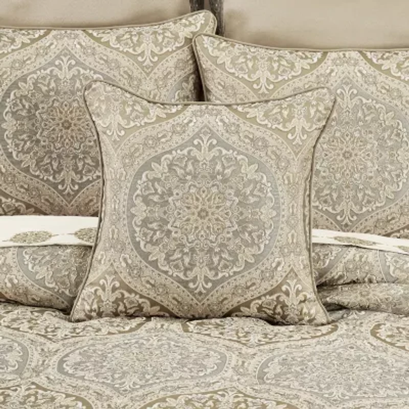 The Rinaldi 20" Square Decorative Pillow is truly luxurious and offers endless elegance. It features an intricate woven medallion in shades of pearl, white and glimmering golds, and it reverses to a woven medallion stripe, allowing you to change up your style. Pair this pillow with the Rinaldi Bedding set for a complete traditional look.
