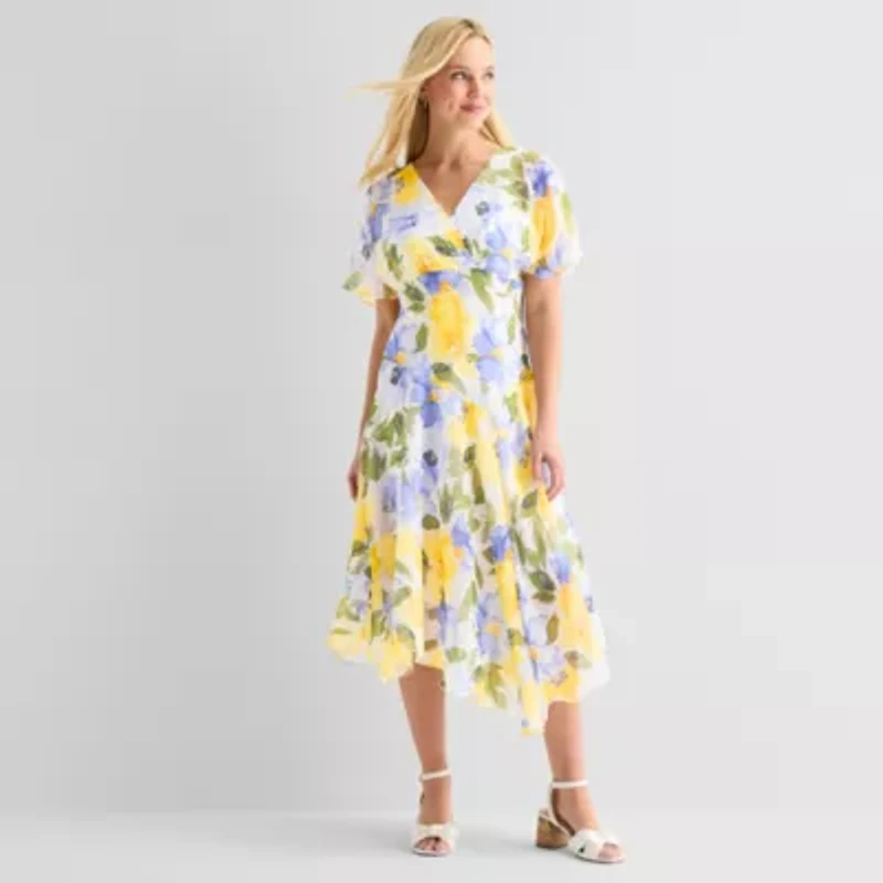 Rabbit Design Womens Short Sleeve Floral Midi Fit + Flare Dress