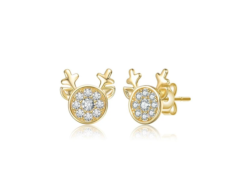 Add a charming and festive sparkle to your jewelry collection with these adorable 14K Gold Plated Stud Earrings. Featuring a whimsical reindeer head design, these earrings capture the magic of the holiday season and are perfect for celebratory events or adding a playful touch to your daily style. Each circular face is brilliantly adorned with multiple clear, round-cut cubic zirconia stones that catch the light with dazzling movement. The polished 14K Gold Plated finish extends to the delicate antlers and ears, enhancing the festive animal motif. Lightweight and eye-catching, these animal head stud earrings blend seasonal cheer with elegant shimmer, making them a delightful and easy-to-wear accessory. They are the ideal choice for a memorable holiday gift or a cheerful accent piece. Bring seasonal charm and sparkle to any look with this enchanting design.