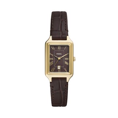 A true classic returns, reimagined for today. Our Raquel watch exudes timeless sophistication with its rectangular case and refined satin dial. The rich, brown croco-embossed leather strap lends a polished touch to this versatile timepiece. Date window, quartz movement—you'll want to keep this stunner in heavy rotation. Fossil leather products support responsible manufacturing via the Leather Working Group.