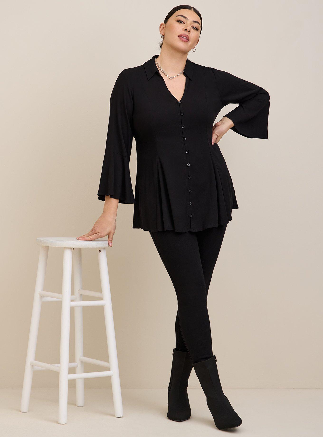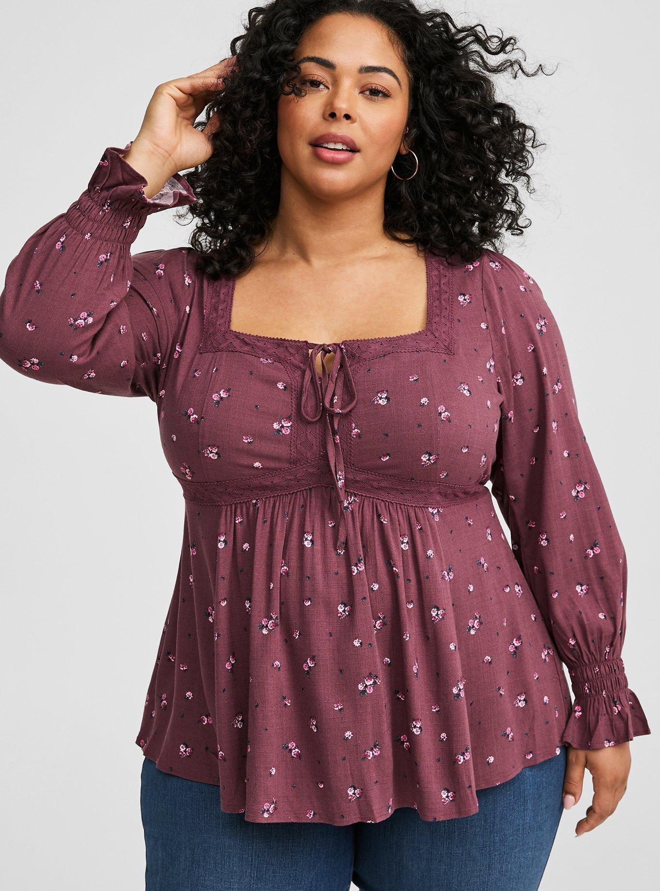 Babydoll Rayon Slub Lace Trim Long Sleeve Top