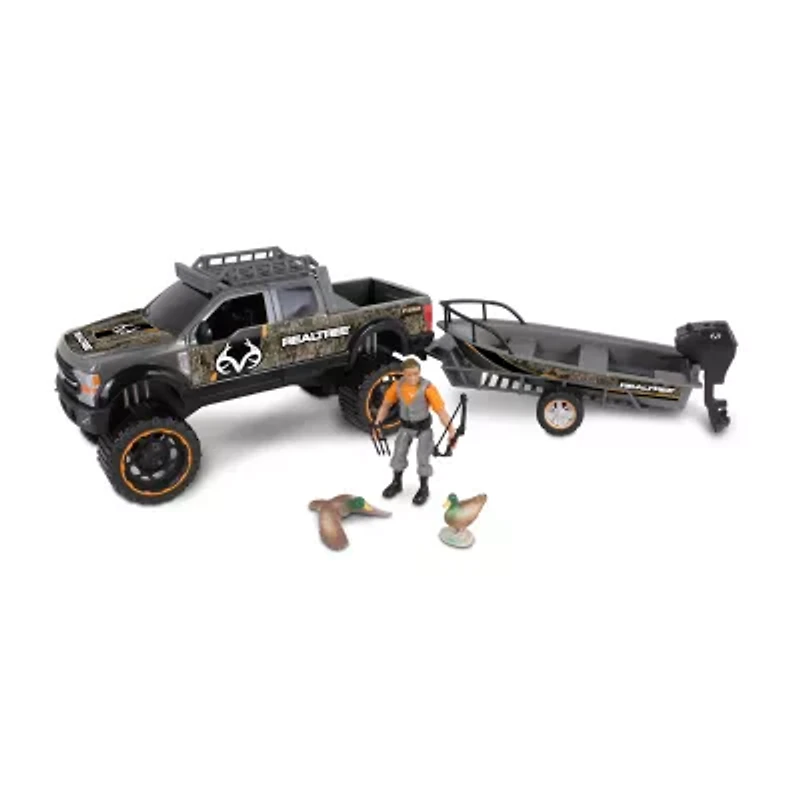Realtree 10 piece playset: ford f250 super duty - ducks - nkok has created an entire realtree universe around our 4" tall hunter with our 1:18 scale freewheel vehicle playsets. Realtree and ford are officially licensed players in this high quality playset. The miniaturized ford f250 super duty is the detailed version of its full scale counterpart. The iconic realtree camouflage adorns many of the parts of the truck and boat and it ties the whole set together. The fully articulated hunter drives an officially licensed and detailed ford f-250 super duty truck with a removable trailer hauling a sleek fishing boat. The freewheeling f-250 and boat feature custom designs in high quality, high-definition realtree timber camo. The hunter and his truck are outfitted with all the accessories for a hunting adventure. The truck includes a roof rack and roll bar, the fishing boat's outboard motor is removable, and the hunter is equipped with a bow and arrows. The set is completed with two realistic, hand painted ducks. There's so much detail in these sets including moving parts, hand painted details, and more! All officially licensed by realtree and ford.