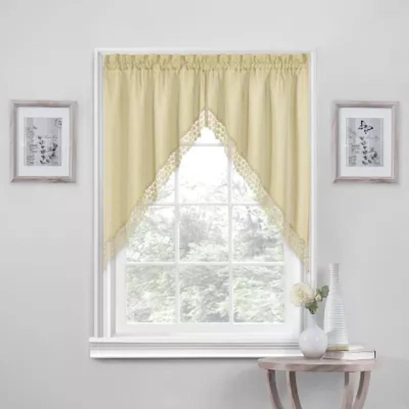 Lacy flowers adorn the edges of this charming swag valance pair. Hang these wherever you want to add a simple but elegant finishing touch.