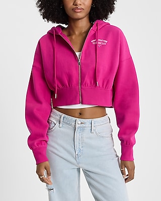 A cropped zip up hoodie in a bright pink color and with a chest graphic.
