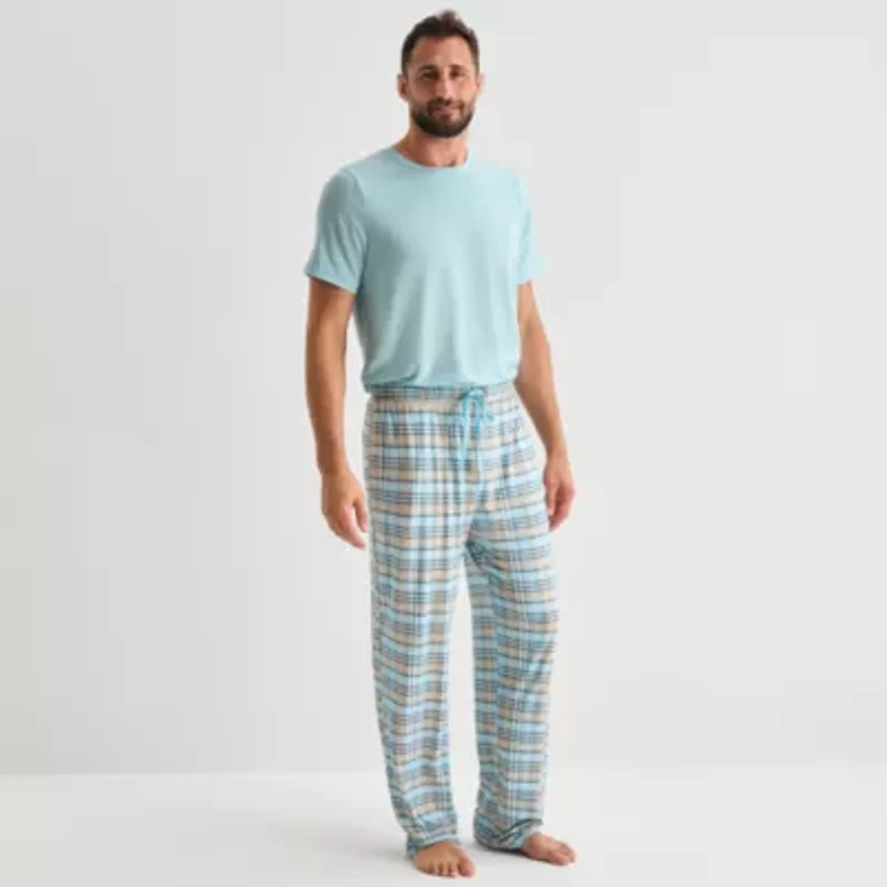 Add extra comfort to your sleep wardrobe with this 2-piece set of men's pajamas from Restwell. Made from soft stretch-knit, this pair includes a crew neck short-sleeve t-shirt and coordinating pull-on plaid pants with an adjustable elastic-drawstring waist.