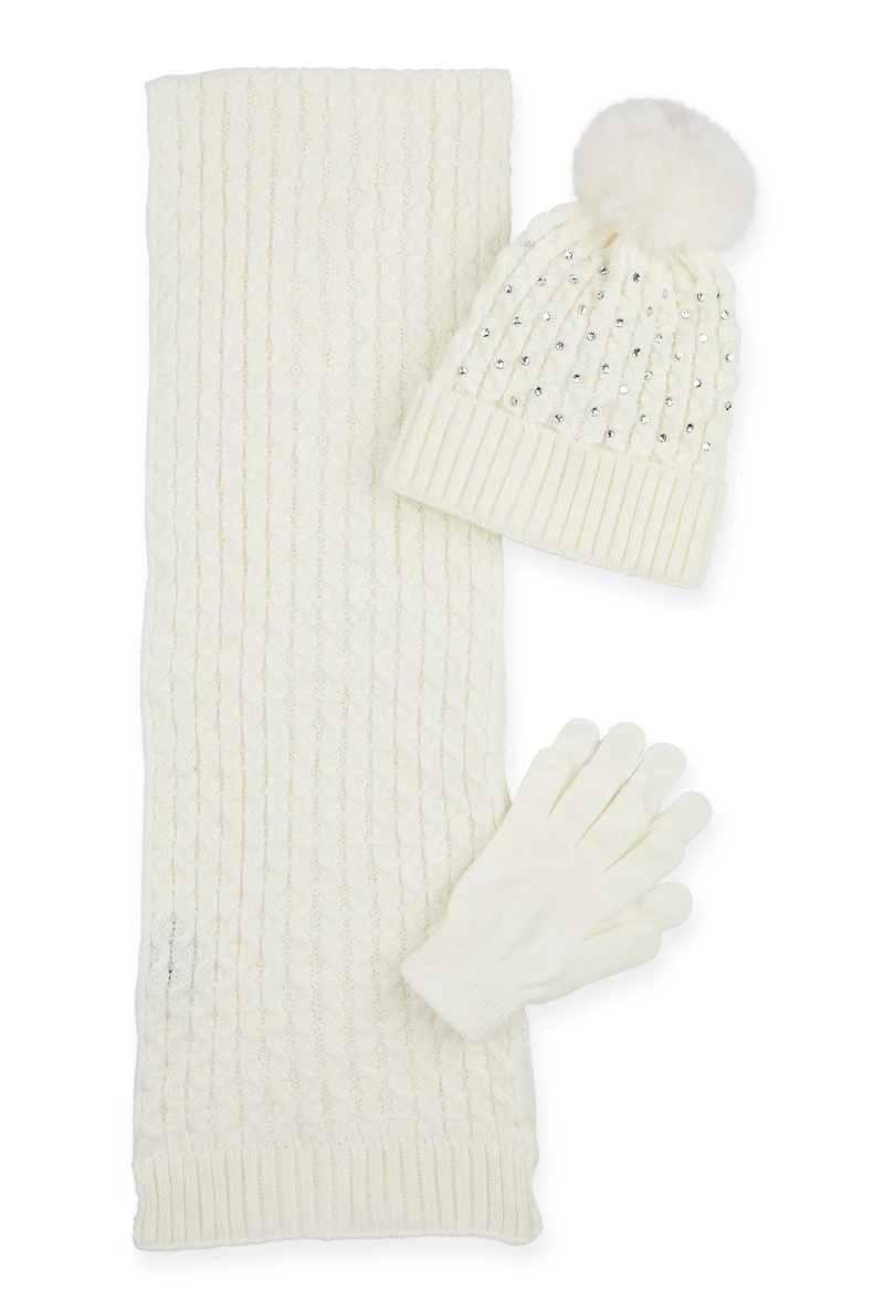 Rhinestone Beanie with Cable Knit Scarf and Gloves