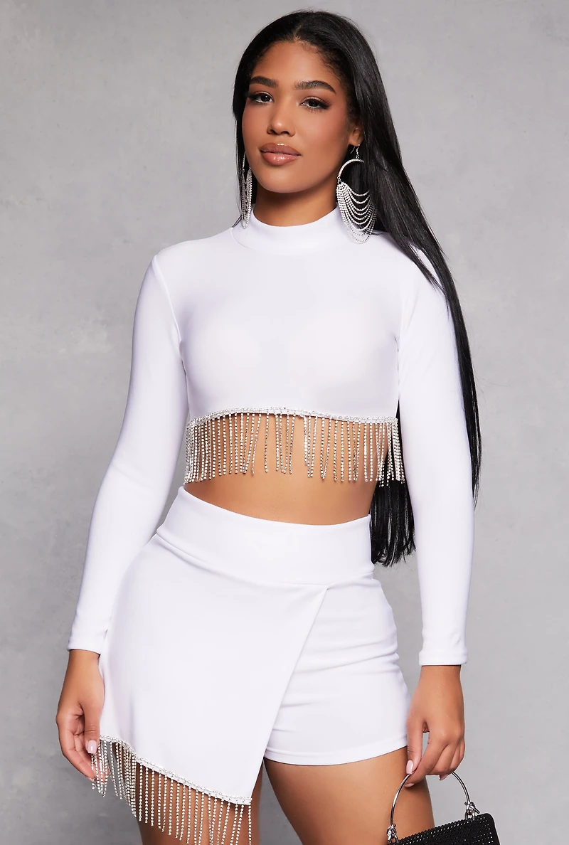 Get ready to turn heads with our Rhinestone Fringe Hem Crop Top. Perfect for adding some sparkle to your night out or making a statement at any casual event, this top combines a classic fit with a fun and flirty fringe detail. The mock neck and long sleeves give it a chic, sophisticated vibe, while the cropped hem keeps it trendy and playful. Whether you're pairing it with high-waisted jeans or skirts, this top is your new go-to for effortless style that screams confidence and fun.