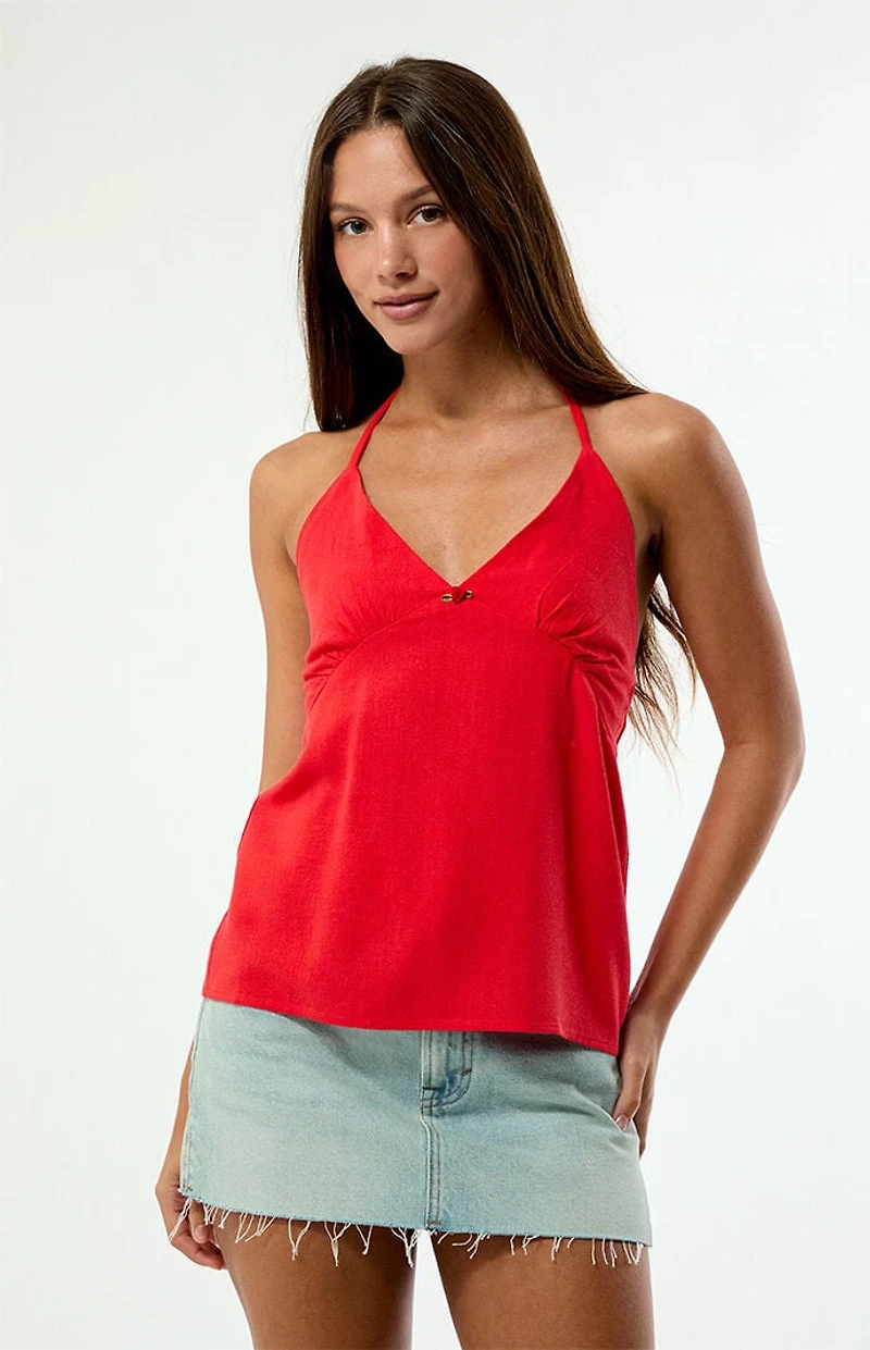 Soak up the sunshine in the Sunny Days Linen Tank Top from Rhythm, bringing effortless, beachy vibes to your look. Made from breathable linen fabric, it features a V-neckline, ruched cups with a rose front detail, an adjustable halter strap, an open back design, and a back tie closure for a light and flattering fit.