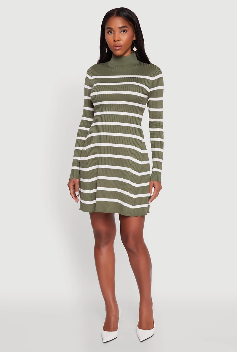 Step out in effortless style with this Rib Knit Striped Long Sleeve Sweater Dress. Designed with a classic fit and a cozy mock neck, this short-length dress blends comfort and casual cool. The ribbed knit fabric hugs you just right while the playful stripes add a fresh vibe to your everyday look. Perfect for brunch dates, weekend strolls, or chill nights out, this sweater dress is your new go-to for easy, stylish layering.