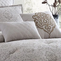 The Kenetic Comforter Set by Riverbrook Home is a beautiful combination of traditional design on a contemporary textured waffle fabric. The soft muted ivory tones make this neutral bedding the perfect canvas to add your own personal touches or keep it simple for a paired down contemporary aesthetic. This lovely Comforter comes with matching shams and decorative pillows to finish the look. Polyester fabric and fill. Machine Washable; follow care instructions on each piece for best result. The digital images we display have the most accurate color possible. However, due to differences in computer monitors, we cannot be responsible for variations in color between the actual product and your screen. The Kenetic Comforter Set is imported.