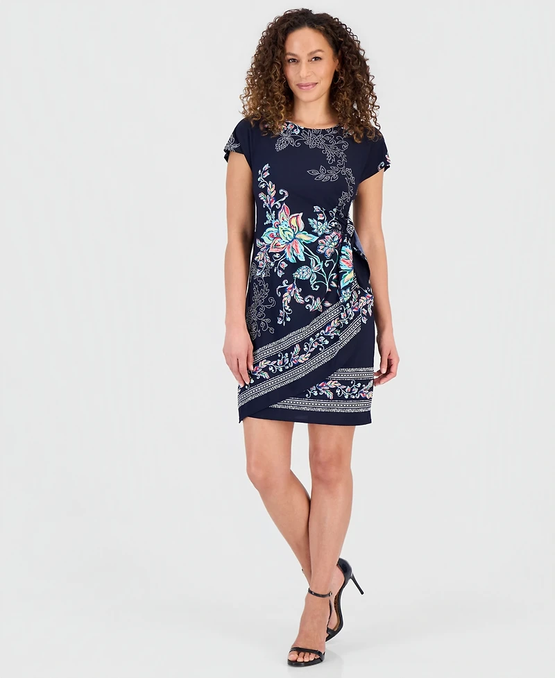 Robbie Bee Petite Printed Faux-Sarong Short-Sleeve Dress