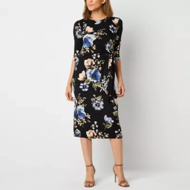 Robbie Bee Womens 3/4 Sleeve Midi Floral Sheath Dress
