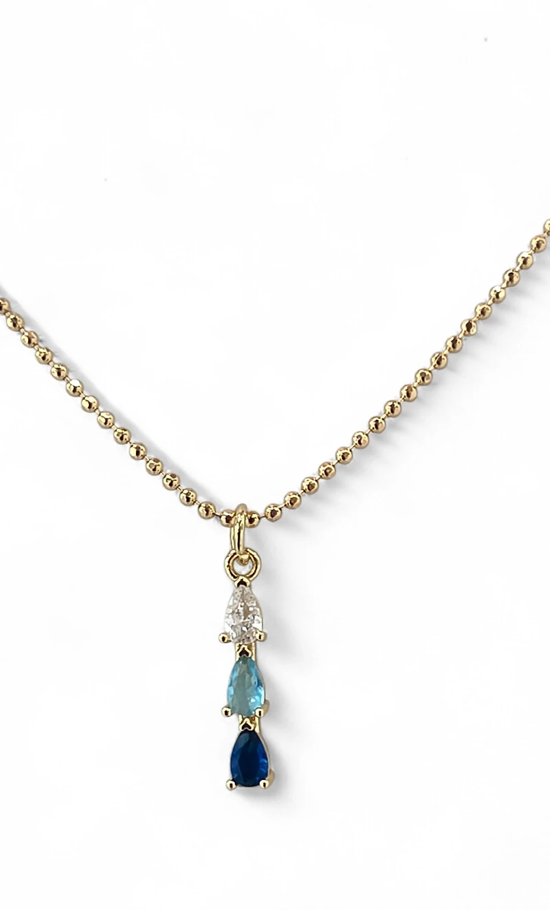 Elegant 18" teardrop charm necklace in warm Brazilian goldfilled with hypoallergenic properties. Featuring a stunning gradient of colorful blue tones that catch the light beautifully. Perfect for layering or wearing solo, this piece combines timeless design with everyday wearability.
