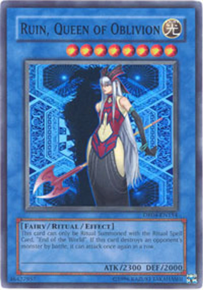 Card Rules: No rulings available for this card. Passcode: 46427957 Set: Dark Revelations 4 ATK/DEF: 2300/2000 Card Number: DR04-EN154 Monster Type: Fairy Rarity: Super Rare Attribute: Light Card Text: This card can only be Ritual Summoned with the Ritual Spell Card , 'End of the World'. If this card destroys your opponent's monster as a result of battle it can attack once again in a row. Level: 8 Card Type: Ritual/Effect Monster Name: Ruin Queen of Oblivion Edition: Unlimited