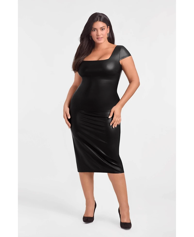 S3 Apparel Women's Sculpting Shapewear Square Neck Cap Sleeve Faux Leather Midi Dress in San Juan, PR