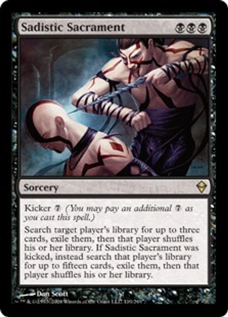 Color: Black Card Text: Kicker {7} (You may pay an additional {7} as you cast this spell.) Search target player's library for up to three cards , exile them then that player shuffles his or her library. If Sadistic Sacrament was kicked instead search that player's library for up to fifteen cards then that player shuffles his or her library. Rarity: R Cost: BBB Card Type: Sorcery Name: Sadistic Sacrament Finish: Regular Card Number: 110/249 Set Name: Zendikar