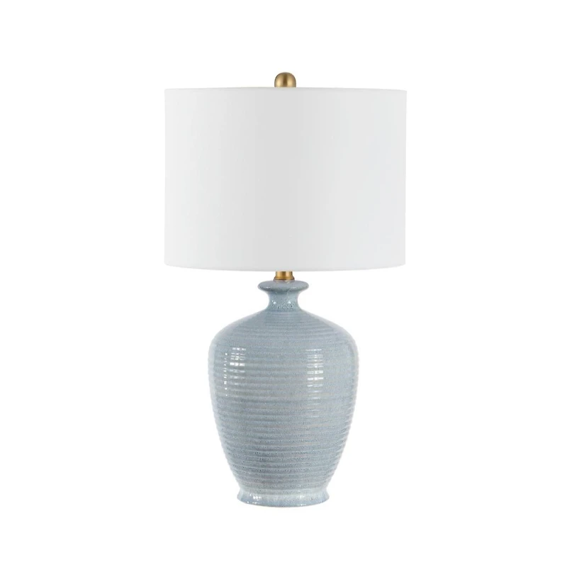 Enrich your decor with this alluring Hanron Table Lamp. Hanron s mottled blue striations beautifully enhances its striking ceramic silhouette while a white drum shade makes Hanron perfect for any contemporary interior.