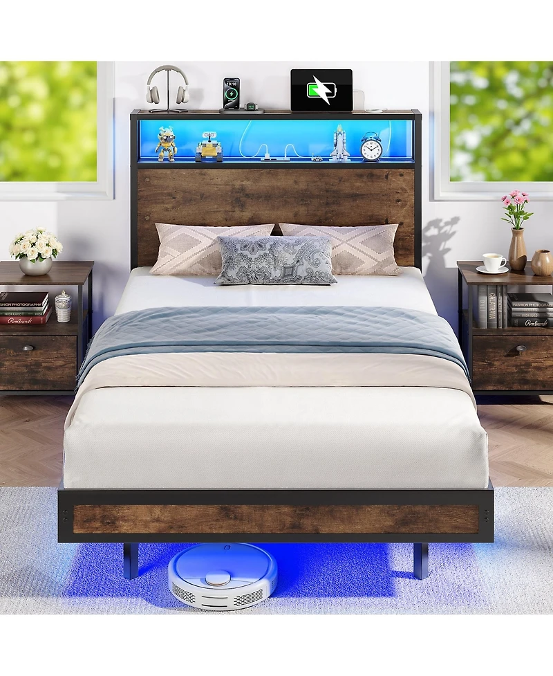 This Floating Bed Frame combines modern design with practical features, featuring hidden metal feet and Led lighting for a floating visual effect, customizable Rgb Led lights, a 2-tier storage headboard, a charging station, a quiet design, and a durable carbon steel frame with a 1,001 lbs weight capacity, all easy to assemble for an upgraded bedroom experience.