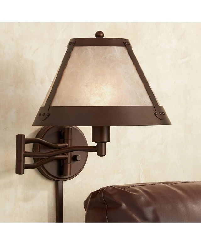 Samuel Rustic Mission Swing Arm Wall Lamp Industrial Bronze Plug-In Light Fixture Natural Blonde Mica Mineral Shade for Bedroom Bedside House Reading