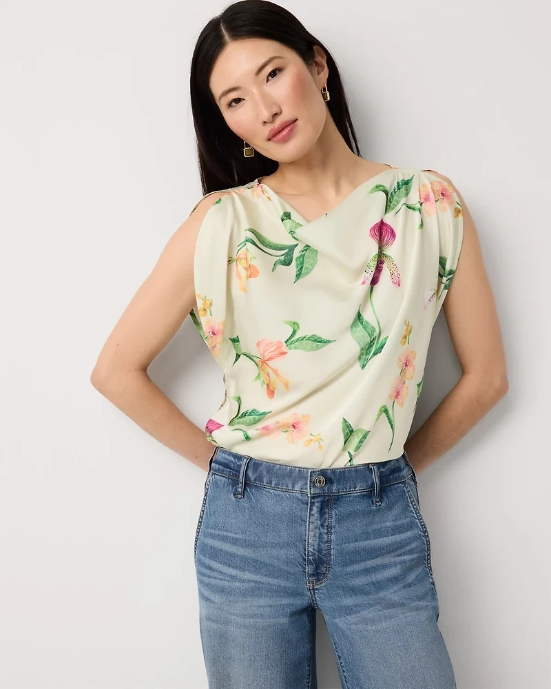 You’ll love the simplicity and elegance of this satin blouse. The petal sleeves and drape neck make this top feminine + modern.
