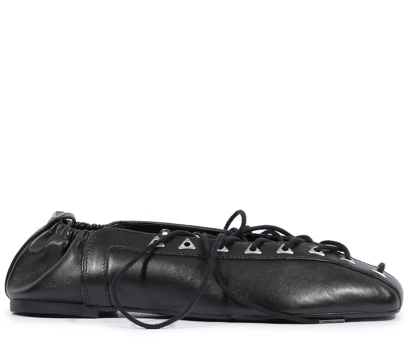 The inara flat channels ballet energy with a sharper, more street-ready approach. Made from sleek brown leather and finished with lace-up detailing, it's both soft and structured, refined yet wearable. The curved vamp and low silhouette give it all-day versatility. Pair with cargo pants, wide-leg denim, or even layered socks and a slip dress for a versatile look, as it's the flat that turns heads—quietly but confidently.